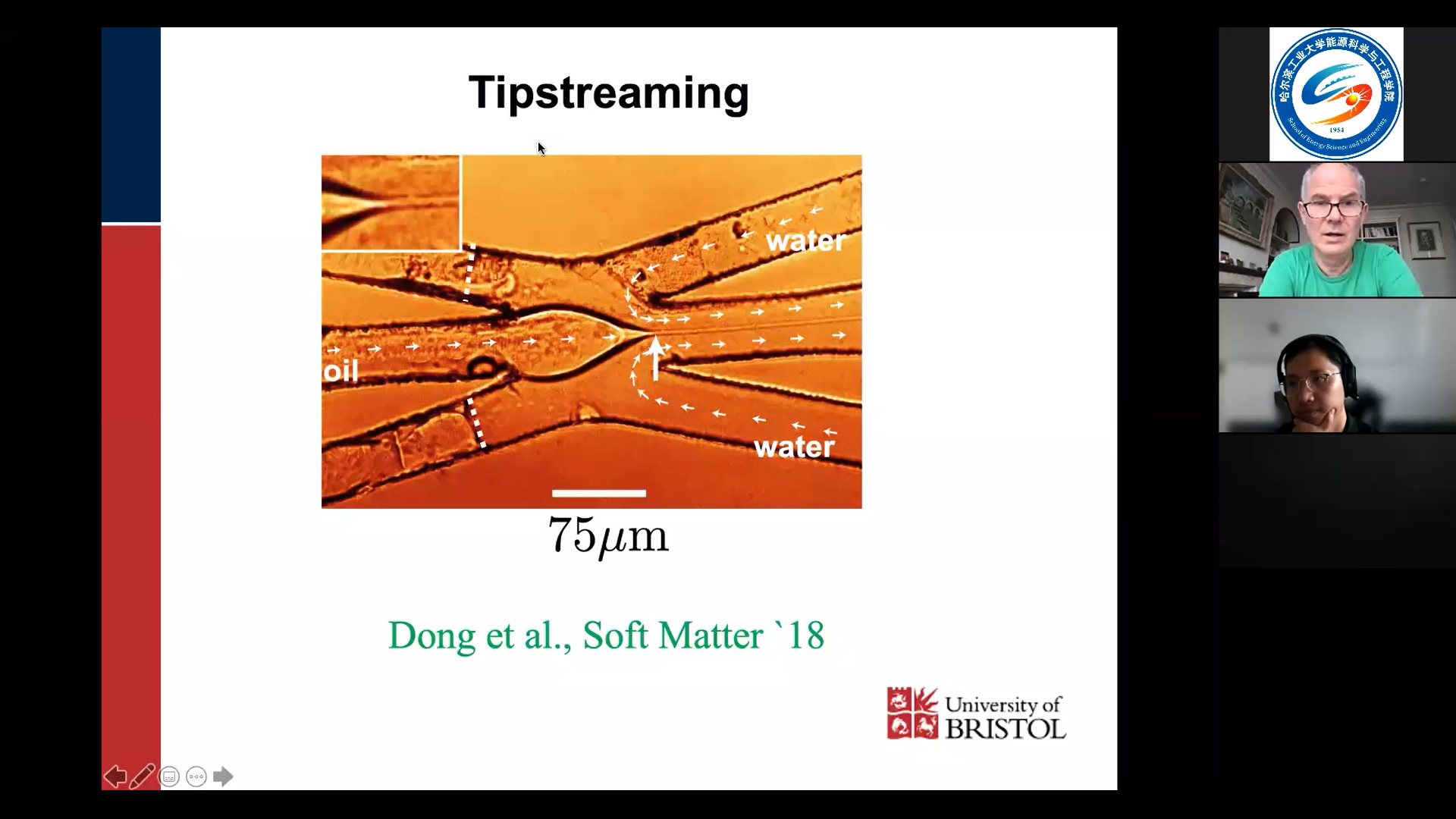 强双曲型流动中的气泡全局解问题最初由G.I. Taylor提出,并久久未能得到解决。一个强粘性流动(其中粘性力的作用远大于表面张力的作用)中自由表面尾部常会发展出一个尖端结构。尽管利用细长体理论进行分析能在一定范围内解释这一现象,但并不能解释气泡尖端处的结构。Eggers教授团队发现气泡尖端的轴对称结构利用尖端曲率进行无量纲化后实则符合一个相似解。这一相似解的形状与圆锥非常相像,但不同的是,这一相似解的斜率是随着到尖端的对数距离的平方根变化的。与细长体理论不同的是,更高一阶的尖端相似解能更好地解释气泡尖端的结构。这一理论与实验结果和斯托克斯方程的数值解结果很好地保持一致。