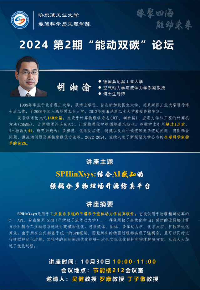 胡湘渝,德国慕尼黑工业大学空气动力学与流体力学系副教授,博士生导师。1999年毕业于北京理工大学,获博士学位。曾在新加坡国立大学、德累斯顿工业大学进行博士后工作,于2006年加入慕尼黑工业大学,2012年获慕尼黑工业大学教授资格审定。发表学术论文近140余篇,发表于计算物理学杂志(JCP, 40余篇)、应用力学和工程的计算机方法(CMAME)、计算物理评论(CPC)、计算物理化学等国际著名期刊。谷歌学术引用超过1万次,H–指数为41。研究兴趣为:多相流、化学反应流、湍流以及非牛顿流等复杂流动问题、流固耦合问题、微流动问题及高精度数值方法等。2022-2024,连续入选了斯坦福大学公布的全球科学家榜单的前2%。