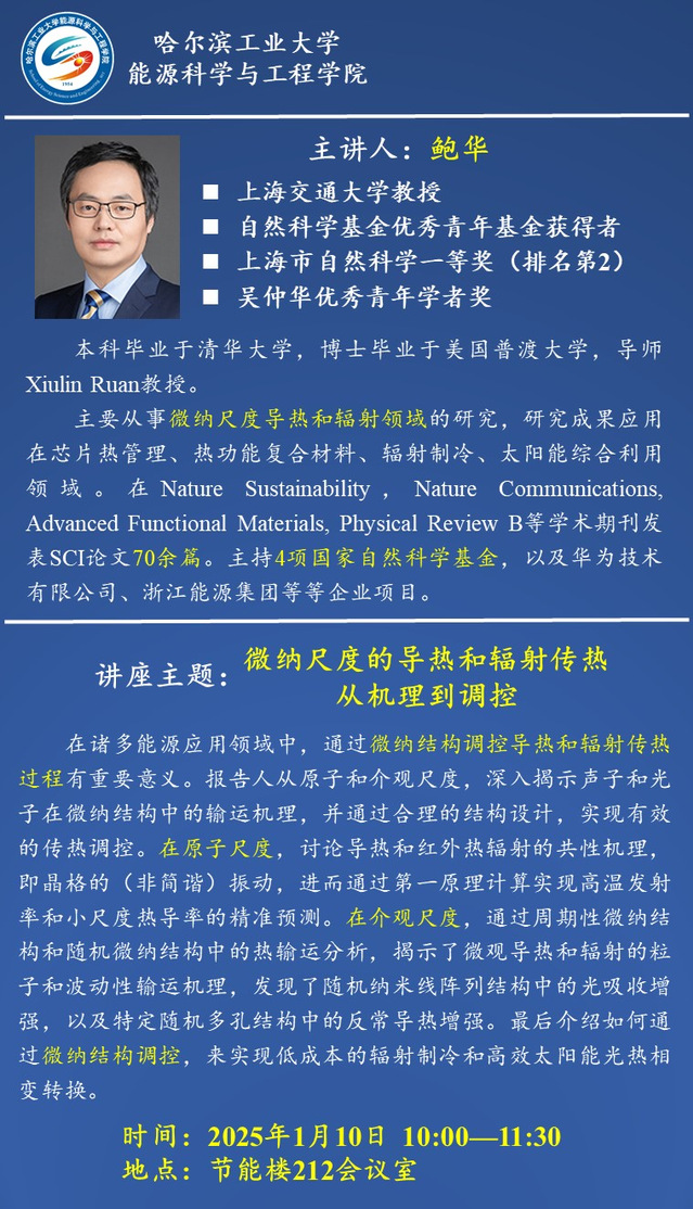 鲍华,上海交通大学教授,自然科学基金优秀青年基金获得者。本科毕业于清华大学,博士毕业于美国普渡大学,导师Xiulin Ruan教授。主要从事微纳尺度导热和辐射领域的研究,研究成果应用在芯片热管理、热功能复合材料、辐射制冷、太阳能综合利用等领域。获上海市自然科学一等奖(排名第2),吴仲华优秀青年学者奖。在Nature Sustainability, Nature Communications, Advanced Functional Materials, Physical Review B等学术期刊发表SCI论文70余篇。主持4项国家自然科学基金,以及华为技术有限公司、浙江能源集团等等企业项目。
