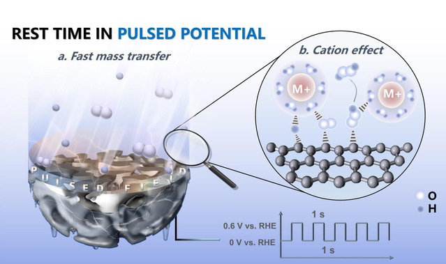 哈工大全媒体(闫明星丁雅妮 周伟 文/图)近日,bat365在线中国官网登录入口高继慧教授团队在新型脉冲电催化体系的机制研究中取得新进展,首次揭示了脉冲供电在氧还原合成过氧化氢(H2O2)体系中对界面物质输运及反应中间体形成动力学的跨尺度调控机制,为发展能源电催化反应调控手段提供了新思路。研究成果以《揭示氧还原反应中脉冲电催化对界面微环境的原位动态调控》(Revealing the In Situ Dynamic Regulation of the Interfacial Microenvironment Induced by Pulsed Electrocatalysis in the Oxygen Reduction Reaction)为题发表在《美国化学学会能源快报》(ACS Energy Letters)上,并入选封面文章。